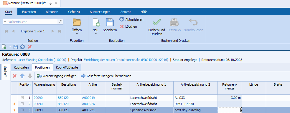 Schritt 3: Eingabe von Liefergegenstand und LiefermengeIm Register "Positionen" erscheinen automatisch alle Lieferpositionen des Wareneinganges, auf den man sich bezieht. In der Spalte Retourenmenge trägt man die Anzahl der zurück zu sendenden Artikel ein.