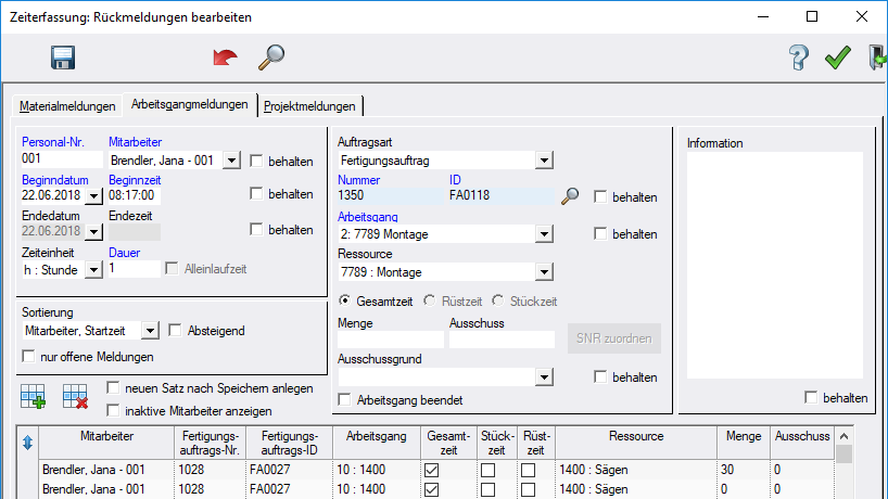 Auf der Registerkarte "Arbeitsgangmeldungen" werden Zeit- und Mengenmeldungen zu Arbeitsgängen angelegt oder bearbeitet.