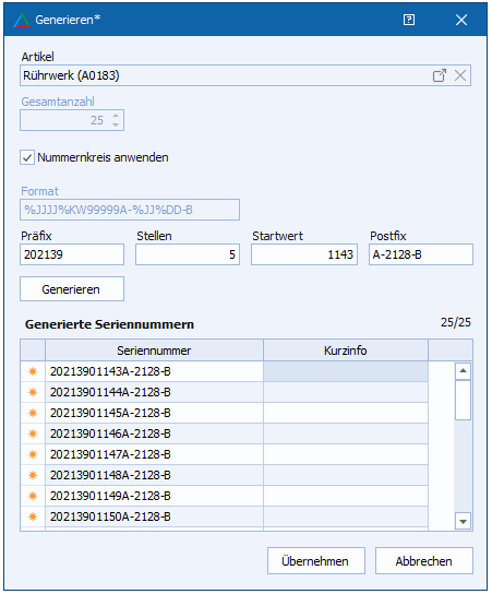 Abb. Seriennummer generieren mit individuellen Einstellungen