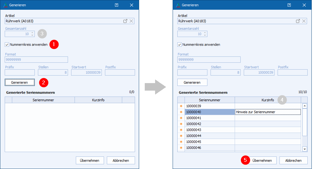 Soll die Seriennummer anhand des im System hinterlegten Nummernkreises generiert werden, so muss das (1) Auswahlfeld "Nummerkreis anwenden" aktiviert sein. Über (2) die Schaltfläche "Generieren" wird die notwendige Anzahl von Seriennummern (3) (Feld "Gesamtanzahl" entspricht dabei der Dokumentenmenge) erstellt und in der Tabelle angezeigt. In (4) der Spalte "Kurzinfo" können Sie bei Bedarf einen Hinweistext pro Seriennummer hinterlegen. Über (5) die Schaltfläche übernehmen werden die generierten Seriennummern in den Dialog "Seriennummern zuordnen" übernommen.