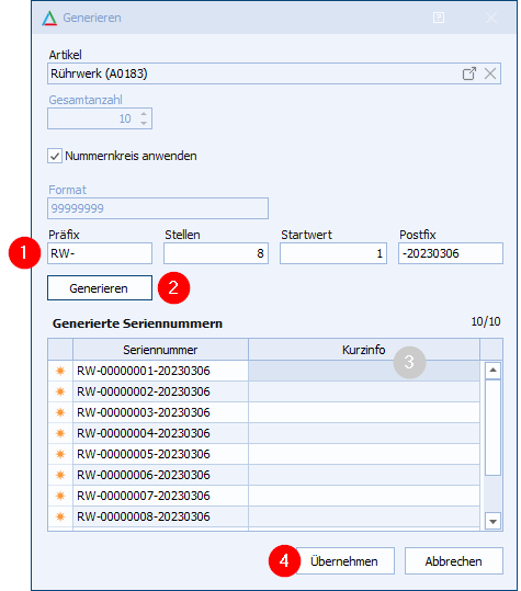 Seriennummer anhand einer individuellen Regel generierenErfolgt die Vergabe der Seriennummern fortlaufend, aber nach individuellen Regeln, welche nicht über den Nummernkreis abbildbar sind, so kann (1) die Stelligkeit, der Prä- und Postfix und ebenso der Startwert manuell vorgegegeben werden. Wird eine dem System bekannte Kombination verwendet, so wird der Startwert ermittelt und vorgeblendet. Über (2) die Schaltfläche "Generieren" wird die notwendige Anzahl von Seriennummern (Feld "Gesamtanzahl" entspricht dabei der Dokumentenmenge) erstellt und in der Tabelle angezeigt. In (3) der Spalte "Kurzinfo" können Sie bei Bedarf einen Hinweistext pro Seriennummer hinterlegen. Über (4) die Schaltfläche übernehmen werden die generierten Seriennummern in den Dialog "Seriennummern zuordnen" übernommen.