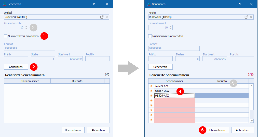 Sollen die Seriennummer händisch erfasst werden, so muss das (1) Auswahlfeld "Nummerkreis anwenden" deaktiviert sein. Über (2) die Schaltfläche "Generieren" wird die (3) notwendige Anzahl von Einträgen (Feld "Gesamtanzahl" entspricht dabei der Dokumentenmenge) erstellt und leer in der Tabelle angezeigt. Die Seriennummern müssen nun (4) in der Spalte "Seriennummer" erfasst werden. In (5) der Spalte "Kurzinfo" können Sie bei Bedarf einen Hinweistext pro Seriennummer hinterlegen. Über (6) die Schaltfläche übernehmen werden die generierten Seriennummern in den Dialog "Seriennummern zuordnen" übernommen.