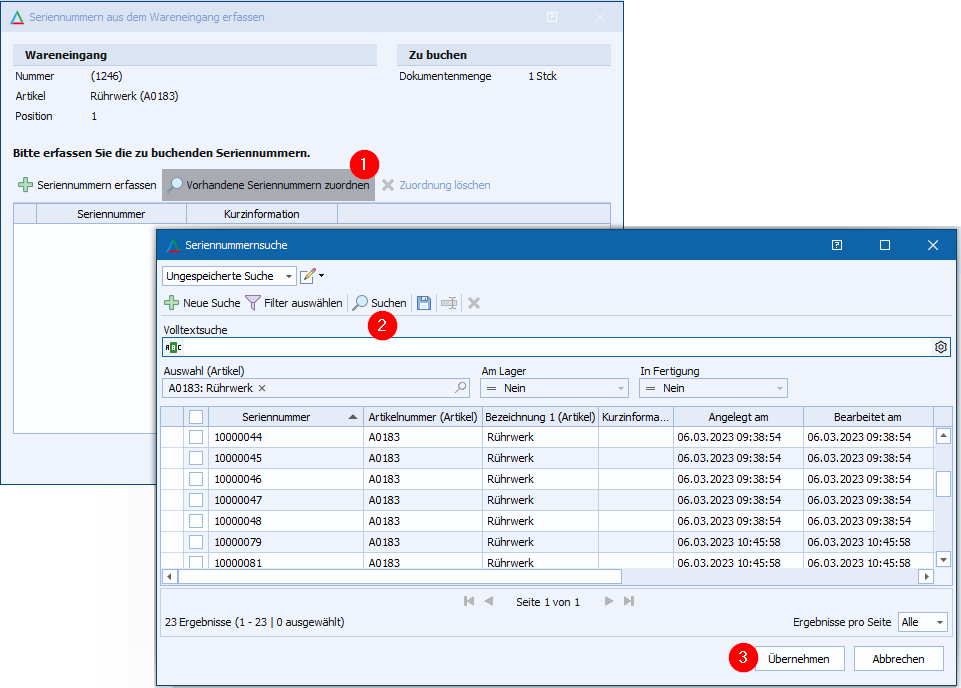 Möchten Sie die Seriennummern dann in Vorgängen verwenden, so wählen Sie statt "Seriennummern erfassen" bitte (1) die Schaltfläche "Seriennummern zuordnen" aus. Sie können anschließend (2) freie Seriennummern zum Artikel suchen und (3) übernehmen.