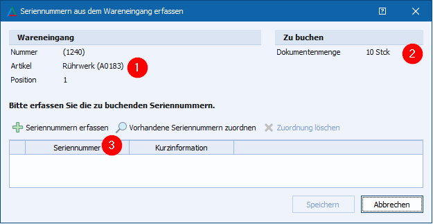 Im Dialog ist (1) der Artikel für welchen die Seriennummern erfasst werden soll, (2) die Menge welche im Beleg erfasst wurde zu sehen. Über (3) die Schaltfläche "Seriennummer erfassen" müssen nun für die Menge neue Seriennummern angelegt werden.