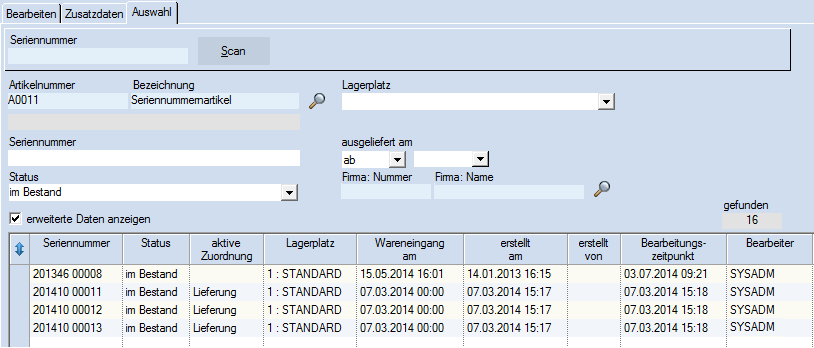 Suche nach bestimmten SeriennummernEine bestimmte Seriennummer kann gesucht werden, indem diese im Scanfeld "Seriennummer" direkt eingegeben oder gescannt wird. In diesem Fall wird die Seriennummer sofort in der Tabelle angezeigt. Anschließend kann eine weitere Seriennummer gesucht werden usw. Damit ist es möglich, beliebige Seriennummern unabhängig vom Status, vom Artikel usw. in einer Liste anzuzeigen. In diesem Fall wird die Option "erweiterte Daten anzeigen" automatisch aktiviert, damit sofort möglichst viele Informationen zur Verfügung stehen.