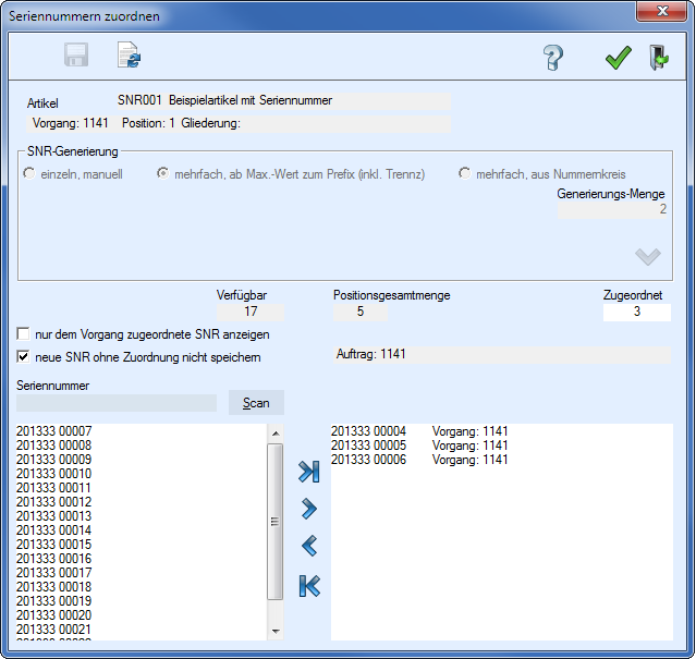 Je nach Modus können bereits vorhandene Seriennummern des ausgewählten Artikels angezeigt und der Auftrags- bzw. Lieferscheinposition zugeordnet werden oder auch neue Seriennummern erzeugt werden.