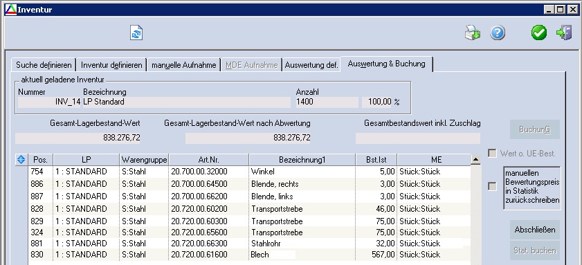 Damit erfolgt automatisch eine Plausibilitätsprüfung: ist der letzte VK kleiner als der ermittelte Bewertungspreis wird automatisch der letzte VK als Grundlage für die Bewertung herangezogen (Niederstwertprinzip). Zusätzlich wird der Marktpreis in diesem Fall in roter Schriftfarbe dargestellt.