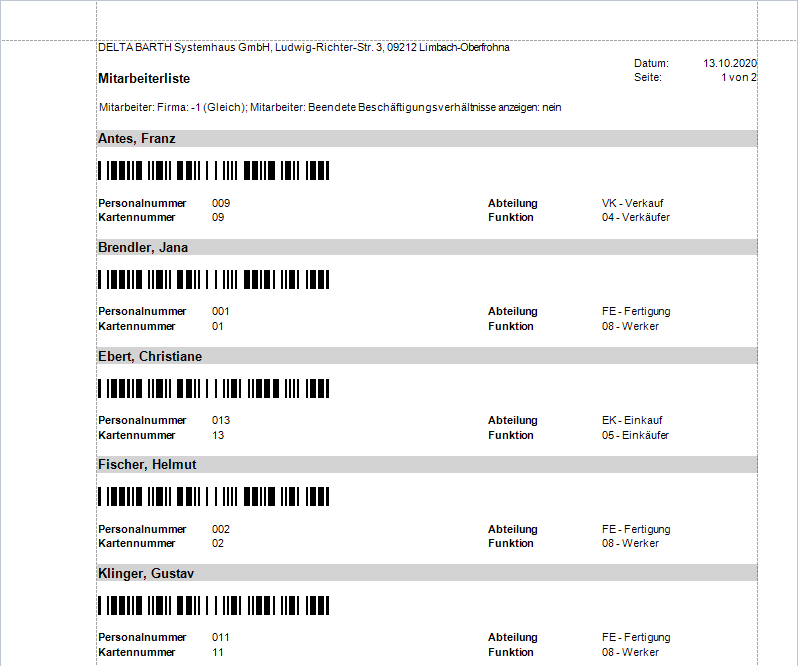 Der Bericht "Personal: Mitarbeiterliste" zeigt alle Mitarbeiter der eigenen Firma mit dem Barcode der jeweiligen Kartennummer an.