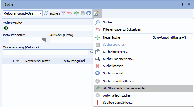 Festlegen von StandardsuchenMöchten Sie regelmäßig die Suche mit einer speziellen, individuellen gespeicherten Suche starten, so können Sie sich diese als Standardsuche definieren. Hierfür suchen Sie sich die gespeicherte Suche aus, die Sie bevorzugt verwenden wollen und wählen dann unter Einstellungen: "Als Standardsuche verwenden" aus. Wenn das Symbol grün ist, dann ist diese Suche aktiv und wird beim Öffnen des jeweiligen DELECO-Moduls entsprechend verwendet. Die nachfolgende Abbildung zeigt dies am Beispiel einer Suche im Modul Einkauf: Retoure: Es soll die Suche "Retourengrund+Bearbeiter" verwendet werden. Diese ist aktiv.