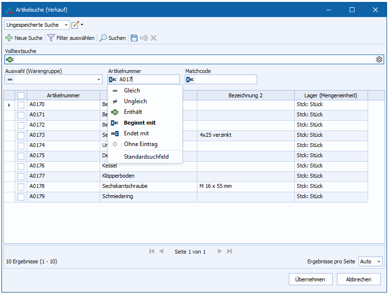Wird beispielsweise die Artikelsuche aus dem Kundenauftrag aufgerufen, kann nach einer eindeutigen Artikelnummer gesucht und der gefundene Artikel direkt in den Kundenauftrag eingefügt werden. Dafür wird der Filter "Artikelnummer" als Standardsuchfeld festgelegt und die Suchart "Gleich" eingestellt.
