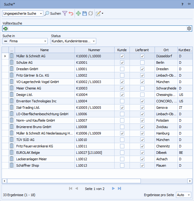 Über das Fenster "Suche" kann in den DELECO Modulen nach den jeweils vorhandenen Datensätzen gesucht werden. Das Fenster enthält dazu eine Auswahlbox, über die vorhandene gespeicherte Suchen aufgerufen werden können, eine Symbolleiste, die Volltextsuche, den Filterbereich, die Suchergebnistabelle sowie Informationen zur Anzahl der Suchergebnisse.