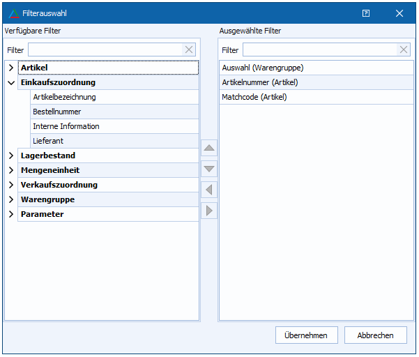 Die Reihenfolge der ausgewählten Filter kann über die Schaltflächen "Pfeil oben" und "Pfeil unten" angepasst werden. Die verfügbaren Filter werden alphabetisch sortiert und nach Modul gruppiert angezeigt und können nicht in ihrer Reihenfolge geändert werden.