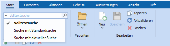 Die Schnellsuche befindet sich in jedem Modul im Menüband links auf der Registerkarte "Start". Über das Suchfeld können Sie direkt nach den Datensätzen des Moduls suchen, ohne das Fenster "Suche" zu verwenden. Verwenden Sie die Tastenkombination "STRG + F" oder F3 um in die Schnellsuche des Moduls zu wechseln.