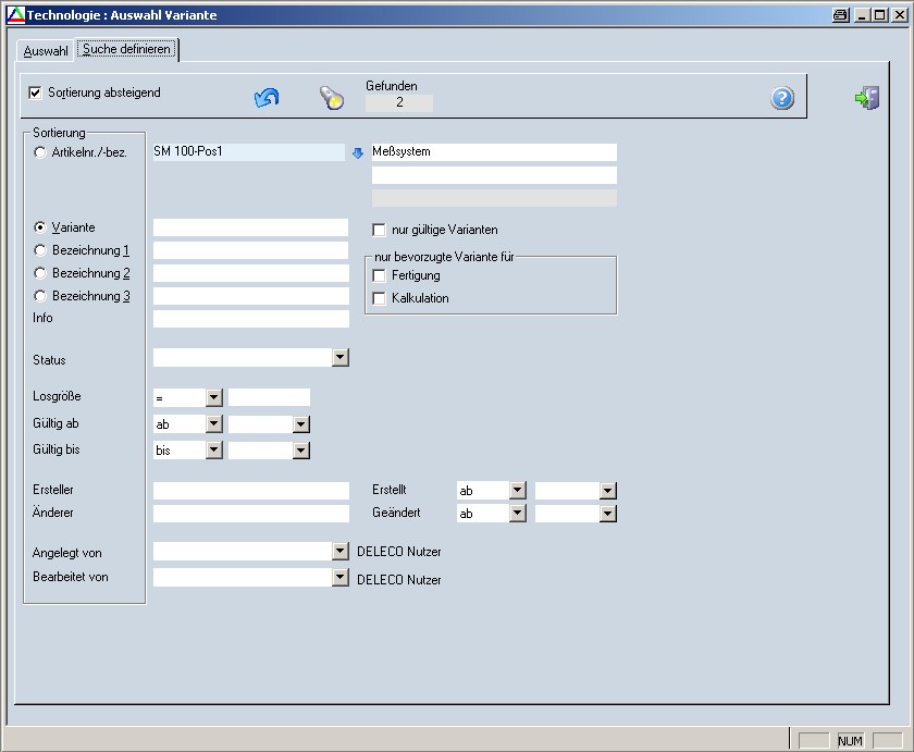 Nach allen zu einer Technologievariante erfassten Daten kann auch innerhalb des Suchdialogs gesucht werden. Hinweis: Beim Suchkriterium "Info" wird nur in den ersten 254 Zeichen der Technologie-Info gesucht."