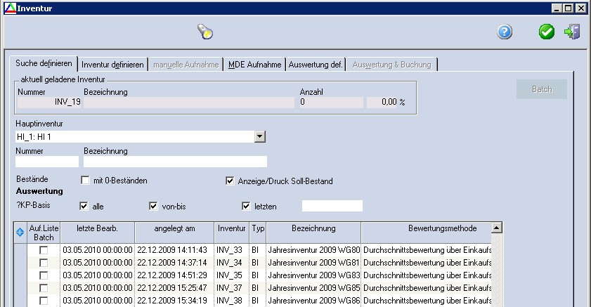 Zunächst ist eine Hauptinventur auszuwählen. Alle Felder entsprechen den in der "Inventur def." und "Auswertung def." beschriebenen.