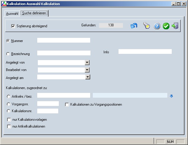 für die Suche nach Kalkulationen, die einem Vorgang oder einem Artikel zugeordnet sind: