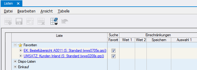 Standardmäßig sind für die einzelnen Listen keine gespeicherten Suchen (Suchkonfigurationen) vorhanden.