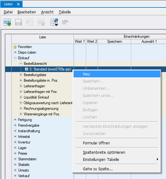 Eine gespeicherte Suche kann durch den Nutzer angelegt werden, indem die gewünschte Variante markiert und anschließend über das Kontextmenü "Neu" gewählt wird.