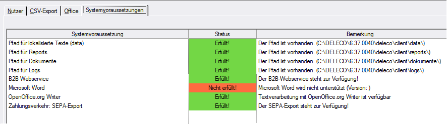Diese Registerkarte bietet einen schnellen Überblick, welche Systemvoraussetzungen ggf. nicht zur Verfügung stehen. Die Anzahl der Prüfungen richtet sich nach den vorhandenen Lizenzen und Optionen.