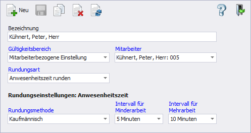 Es wird die Summe der an einem Tag angefallenen Arbeitszeiten entsprechend des Intervalls gerundet. Dabei kann jeweils für Minder- und Mehrarbeit ein separates Intervall angegeben werden.