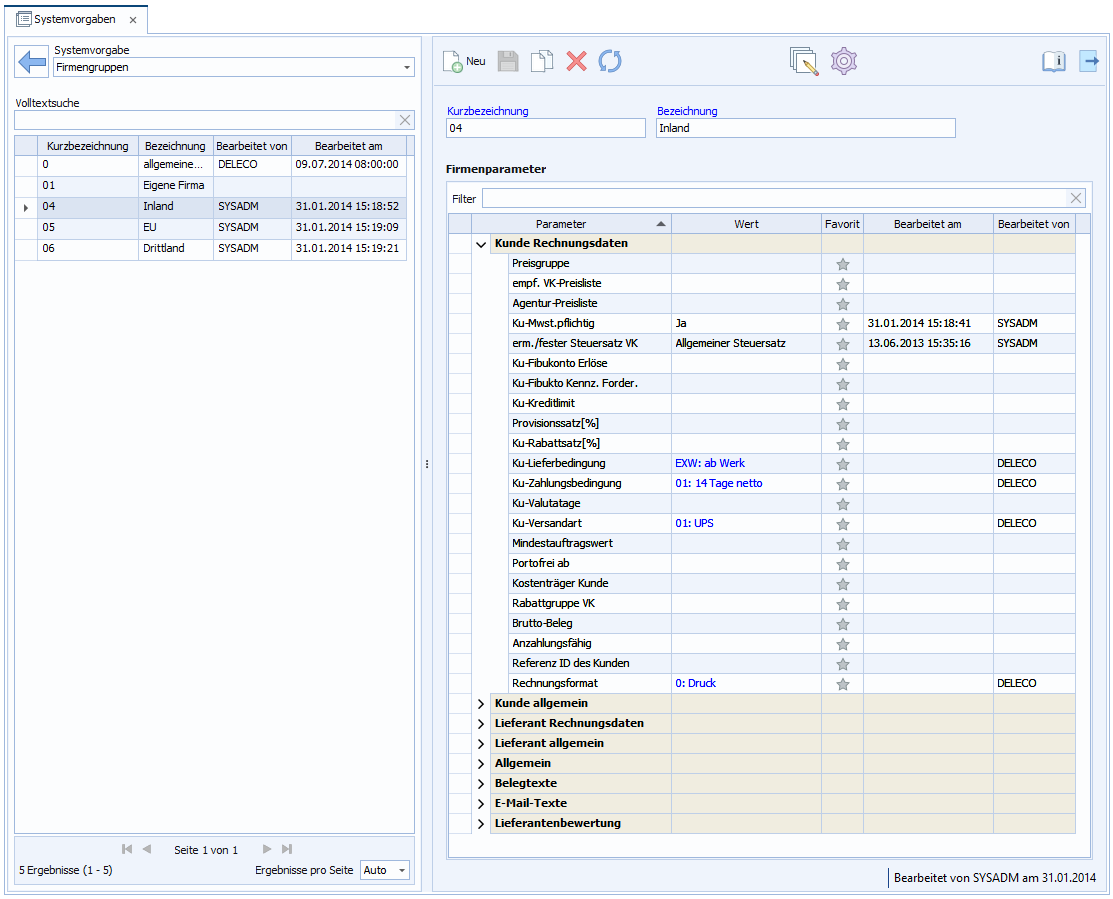 In der Systemvorgabe "Firmengruppen" werden die im System verwendeten Firmengruppen verwaltet. DELECO stellt standardmäßig vier Firmengruppen bereit.