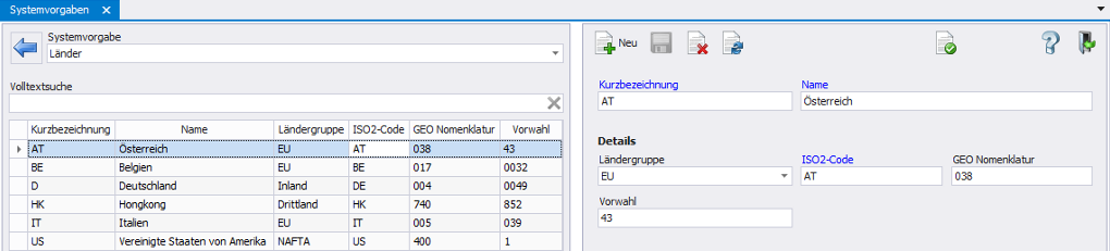 In der Systemvorgabe "Länder" werden die im System verwendeten Länder verwaltet. Standardmäßig ist das Land "D - Deutschland" im System vorhanden.