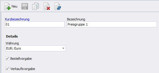 Eine neue Preisgruppe wird über die Schaltfläche "Neu" angelegt. Neben der Kurzbezeichnung und der Bezeichnung können folgende Angaben festgelegt werden: