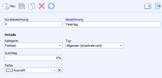 Um eine Zeitart anzulegen, wählen Sie in der Symbolleiste die Schaltfläche "Neu" und tragen eine Bezeichnung sowie optional eine Kurzbezeichnung für die Zeitart ein.