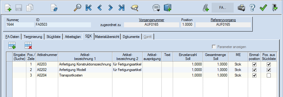 Auf der Registerkarte "SEK" können Sondereinzelkostenpositionen (Artikel vom Typ "Sondereinzelkosten") erfasst werden. Die Erfassung der Positionen erfolgt in gleicher Weise wie die Erfassung von Stücklistenpositionen.