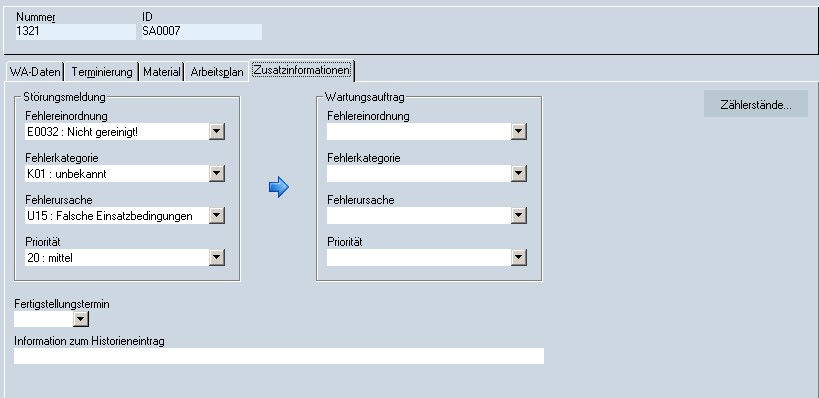 Mit Betätigen der Schaltfläche "Pfeil rechts" können die Daten aus der Störungsmeldung in den Wartungsauftrag übernommen werden. Die Fehlerangaben des Wartungsauftrages werden dadurch überschrieben.