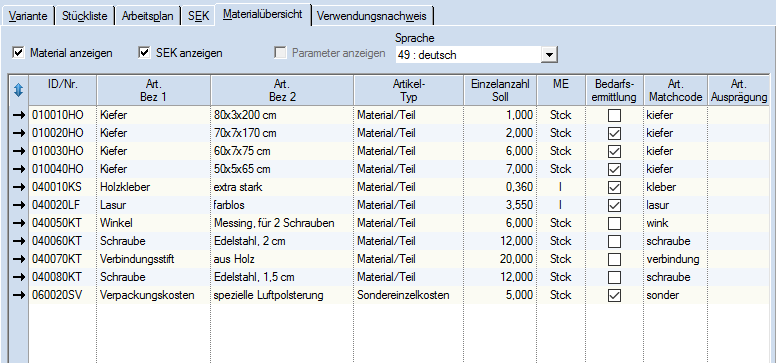 Auf der Registerkarte "Materialübersicht" werden alle Materialien und deren Mengen summiert über alle Stufen der Technologievariante aufgelistet:
