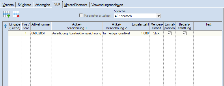 Die Registerkarte "SEK" ermöglicht die Erfassung von Sondereinzelkostenpositionen zu einer Technologievariante. Die Erfassung der Positionen erfolgt in der gleicher Art und Weise wie das Erfassen von Stücklistenpositionen (siehe Stückliste).