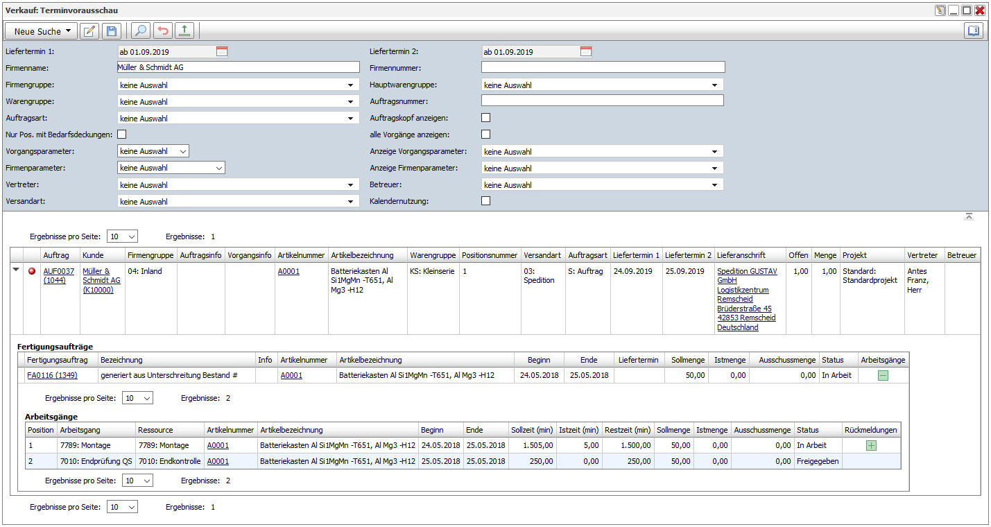 Das Portlet "Verkauf: Terminvorausschau" gibt analog dem Portlet "Versandübersicht" Auskunft darüber, welche Verkaufsaufträge zu einem bestimmten Zeitpunkt geliefert werden müssen und informiert darüber, welche Fertigungsaufträge bzw. Arbeitsgänge die Ursache für eine Verzögerung sein können.