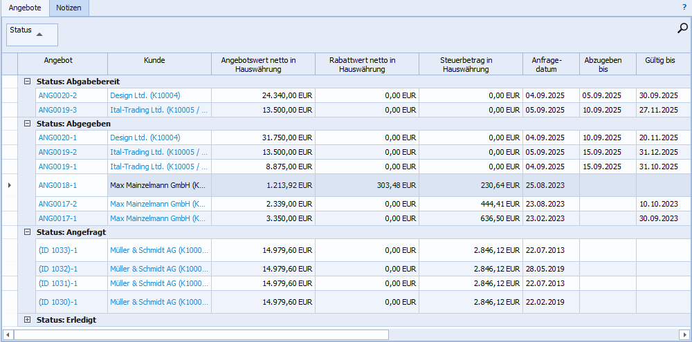Abb.: Auszug aus der Auswertung "Angebote", gruppiert nach der Spalte Angebotsstatus