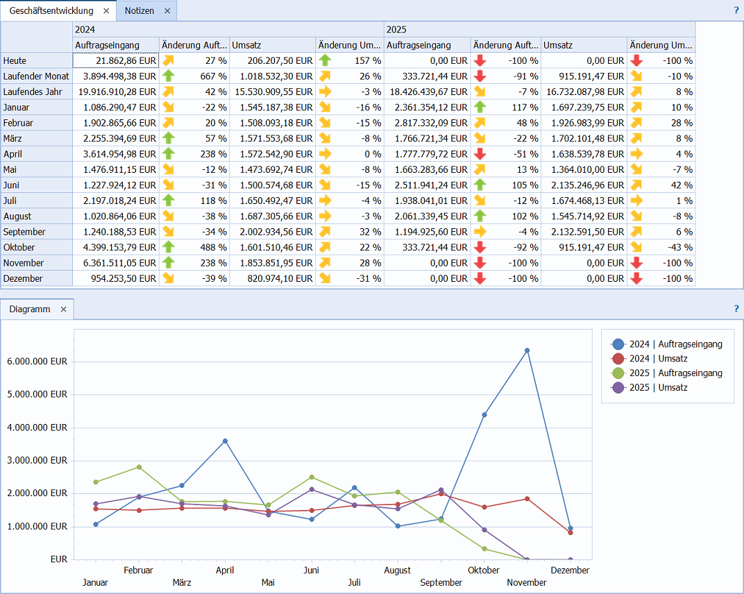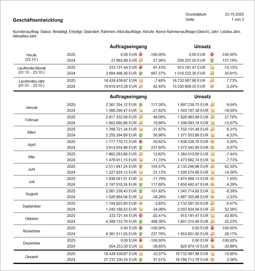 StandardspaltenIn der Auswertung stehen standardmäßig die Spalten: •Auftragseingang •Änderung Auftragseingang in % •Umsatz •Änderung Umsatz in % zur Verfügung.