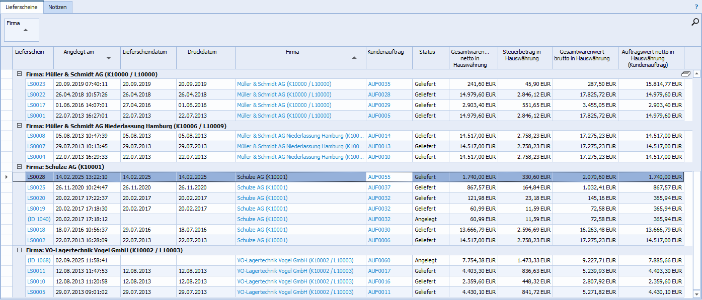 Abb.: Auszug aus der Auswertung "Lieferscheine", gruppiert nach Kunden