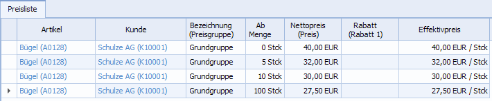 Die Preisliste zeigt die Verkaufspreise für ausgewählte Artikel, für die ausgewählten Preisgruppen und Firmen an. Vererbte Preise und Rabatte werden blau dargestellt.