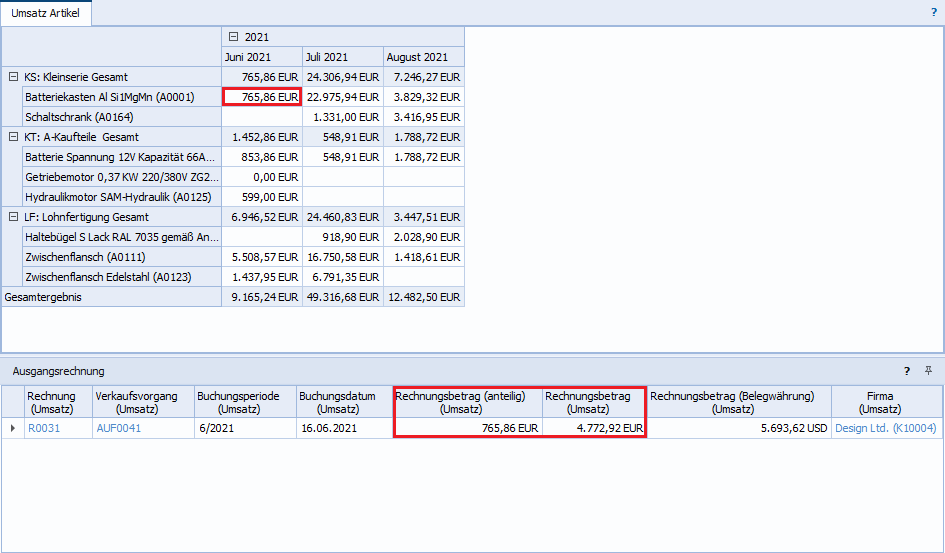 BeispielFür den ausgewählten Artikel gibt es eine Rechnung im Juni 2021. Es wurde ein Umsatz von 765,86 Euro innerhalb der angegebenen Rechnung erzielt und dieser wird in der Spalte "Rechnungsbetrag (anteilig)" angezeigt. Der Gesamtrechnungsbetrag für diese Rechnung beträgt 4.772,92 Euro.