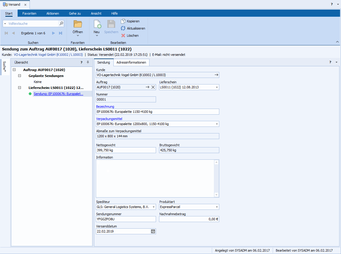 AllgemeinesDas Modul dient der Planung und Bearbeitung von Sendungen. Es können u.a. Verpackungsmittel, Versanddatum, Spediteur und Sendungsnummer hinterlegt werden. Wird eine Sendung verschickt, so kann zudem sprachabhängig eine E-Mail an den Kunden gesendet werden. Eine Strukturübersicht bietet einen Überblick über alle geplanten Sendungen zum Kundenauftrag und auch über alle Sendungen eines Lieferscheins.