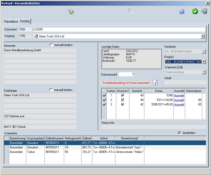Pro Sendung kann eine Datei ausgegeben werden, mit welcher die Sendungsdaten an das Versandprogramm EASYLOG übergeben werden. Dort werden die Daten vervollständigt und die Frachtpapiere sowie die Etiketten erstellt. Die Ausgabe ist für Sendungen ins In- und Ausland möglich.