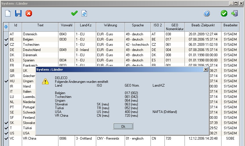 In DELECO sind in den Länderdaten (Einstellungen - System - Menü "Allgemein 1" - Länder...) die korrekten Ländergruppen sowie die korrekten ISO2-Kennzeichnungen (siehe ISO 3166-2) zu hinterlegen. Es steht eine Prüffunktion zur Verfügung, die für alle Daten bzw. für ein ausgewähltes Land ausgeführt werden kann. Letzteres erfolgt durch einen Doppelklick auf den Zeilenkopf der zu prüfenden Zeile. Geprüft werden das ISO2-Kürzel, die GEO-Nomenklatur sowie die Ländergruppe. Voraussetzung ist mindestens ein korrekt eingetragener Ländername bzw. (empfohlen) das ISO2-Kürzel.