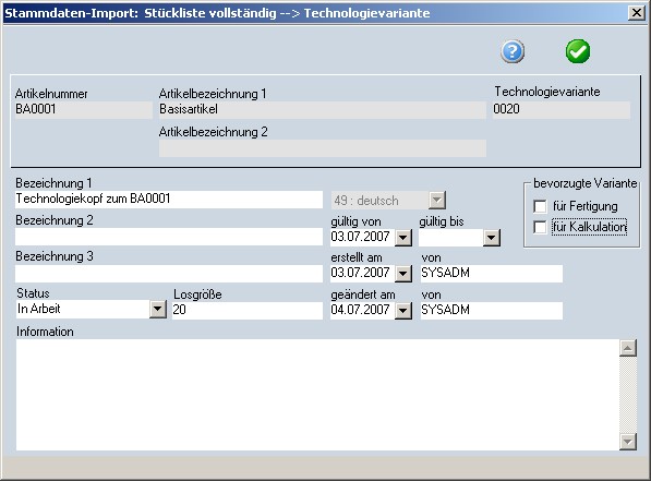 Zum Basisartikel und zu dessen Stückliste wird bei jedem Import eine neue Variante angelegt.Die neue Variante stellt die aktuell gültige Variante dar. Schon vorhandene Varianten werden ungültig gesetzt. Soll die neue Variante rückwirkend gültig sein, wird die Gültigkeit der neuen Variante den schon vorhandenen Varianten angepasst.Dazu werden in der Importdefinition die entsprechenden Werte erfasst. Über die Schaltfläche "Technologie" kann der Nutzer direkt zum Erfassungsdialog oder zum Technologie-Suchdialog wechseln. Sofern zum Vorlageartikel Technologievarianten existieren, werden diese im Suchdialog angezeigt. Der Nutzer kann eine Variante auswählen und die Daten beliebig ändern oder die vorhandene Variante nutzen. Existiert zum Basisartikel schon eine Stückliste, bleibt diese erhalten und wird nicht gelöscht. Gleiches gilt für eine schon vorhandene Technologievariante. Die Speicherung der Daten erfolgt temporär für den aktuellen Lauf. Beim nächsten Import müssen die Werte neu eingegeben werden. Wählt der Nutzer keine Variante aus bzw. gibt keine Daten ein, wird eine leere Variante angelegt.