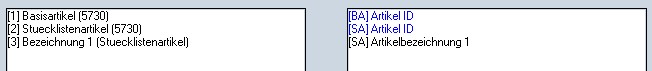 2001 - [BA] Artikelbezeichnung 1 2002 - [BA] Artikelbezeichnung 2 2003 - [BA] Matchcode 2016 - [BA] Artikelinfofeld 2251 - [BA] Mengeneinheit Lager ID 2252 - [BA] Mengeneinheit Lager Text 2203 - [BA] Warengruppen ID 2204 - [BA] Warengruppen Text 3319 - [BA-KU] Firma Name 1 3311 - [BA-KU] Kundennummer 3034 - [BA-KU-A] Ku-Bestellnummer