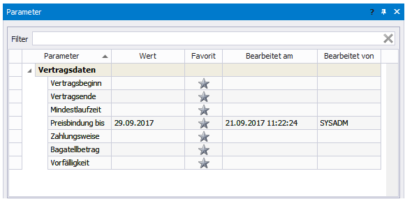 Die Parameter eines Kundenauftrags werden im Fenster "Parameter" unter der Gruppe "Vertragsdaten" zusammengefasst und verwaltet.