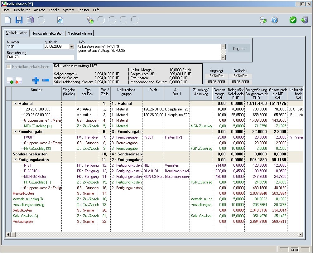 Im Modul "Verkauf" auf der Registerkarte "Angebot" bzw. "Auftrag" muss die zu kalkulierende Position markiert werden. Die Positionskalkulation wird über die Schaltfläche "Kalkulation" aufgerufen oder indem im Kontextmenü (rechte Maustaste) die Funktion „Position kalkulieren“ aufgerufen wird. Eine Vorgangskalkulation wird angelegt.