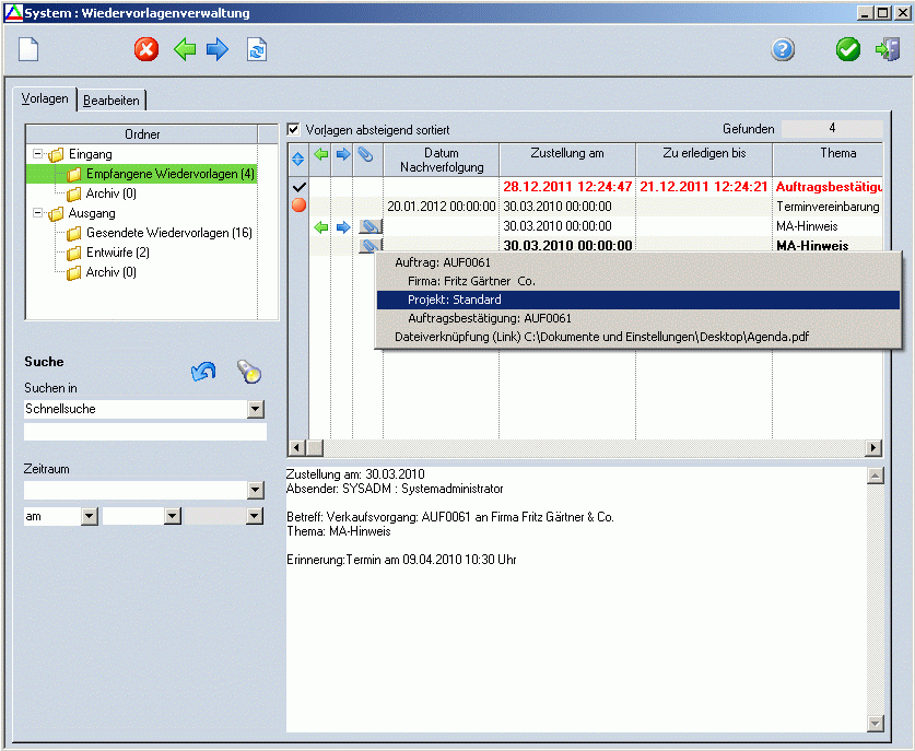 Anhänge und Verweise, welche der Wiedervorlage hinzugefügt wurden, sind durch ein Büroklammer-Symbol gekennzeichnet. Die einzelnen Verweise können per Mausklick auf das Symbol angezeigt und aufgerufen werden.