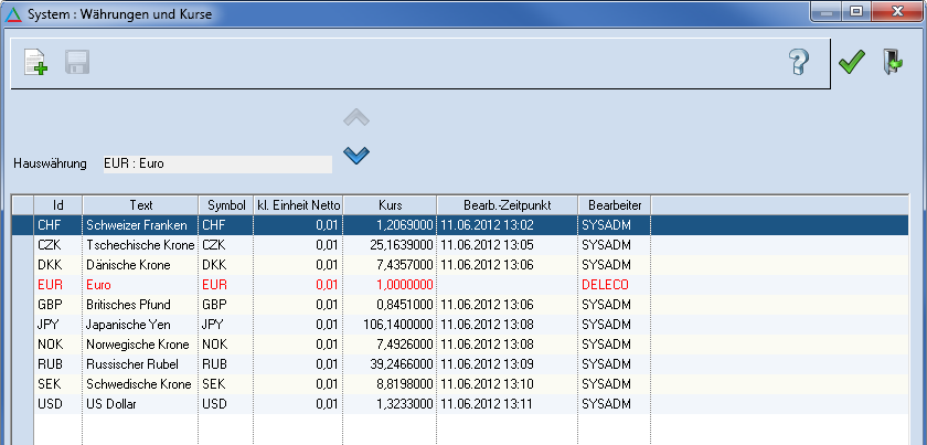Modulnavigation: Bereich Einstellungen - Modulgruppe System - Modul Systemvorgaben - Gruppe Allgemeine Vorgaben - Systemvorgabe Währungen WährungenIm Dialog "Währungen und Kurse" werden alle Währungen, welche im System verwendet werden sollen, vor der Benutzung in der Währungstabelle angelegt. Um mit unterschiedlichen Währungen arbeiten zu können, muss eine Basiswährung (Hauswährung) mit dem Kurs = 1 definiert werden. Dies ist der Euro. Die Hauswährung wurde bei der Installation als interner Parameter festgelegt. Sie kann nur vom Fachhändler verändert werden. Die Hauswährung wird in der Währungstabelle in roter Schriftfarbe angezeigt.