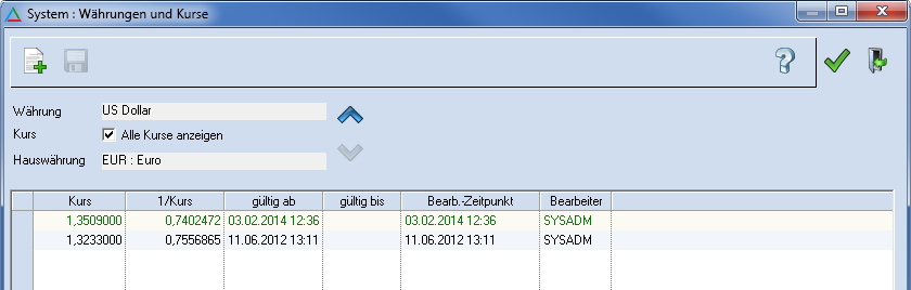 Für jede Währung gilt zur entsprechenden Zeit genau ein Kurs, dieser wird in der Tabelle in grüner Schriftfarbe angezeigt. Bei Kursänderungen ist ein neuer Kurs für die entsprechende Währung mit dem dazugehörigen Gültigkeitsdatum zu erfassen. Liegt das Datum "gültig ab" in der Zukunft, wird beim Speichern der zukünftige Wert in einer neuen Zeile erfasst, ist das Datum "gültig ab" das Datum des laufenden Tages, wird nach dem Speichern nur der aktuelle Wert angezeigt. Alle vorher erfassten Werte können durch Aktivieren des Auswahlfeldes "Alle Kurse anzeigen" in der Tabelle eingeblendet werden.