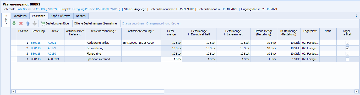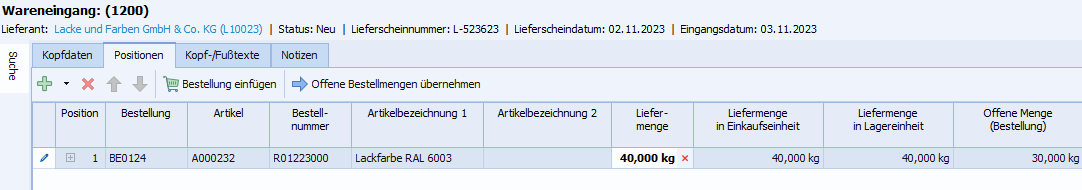 Hinweis zum Ändern von Lieferanten: Sie können den Lieferanten noch ändern, so lange noch keine Artikelpositionen erfasst sind (siehe Schritt 3). Hierzu wählen Sie im Suchfeld "Lieferant" das 'Eingabe löschen' Symbol und bestätigen die Meldung mit Ja. Danach kann regulär über die Firmensuche ein anderer Lieferant ausgewählt und im Wareneingang gespeichert werden. Schritt 3: Eingabe von Liefergegenstand und LiefermengeUm die eigentliche Warenlieferung zu erfassen, wechseln Sie in die Registerkarte "Positionen". Hier werden standardmäßig alle offenen Bestellartikel vorgeblendet. Sie tragen lediglich die gelieferten Mengen in die Spalte "Liefermenge" ein und kontrollieren die automatisch vorgeblendeten Artikel aus der Bestellung. Durch Einfügen (grünes Plus) und / oder Ändern (rotes Kreuz) können Sie Artikelpositionen ändern (neu einfügen bzw. löschen). Es können auch Artikel eingefügt werden, die nicht lagergeführt sind. Das Einfügen von Textpositionen wird an dieser Stelle nicht mehr unterstützt. Nutzen Sie für Hinweise oder Ähnliches die Spalte "Notiz" bzw. die gleichnamige Registerkarte (siehe Schritt 4). Enthält die Lieferung Artikel, die zu einer anderen Bestellung gehören, so kann diese über die Schaltfläche "Bestellung einfügen" im Vorgang ergänzt werden.