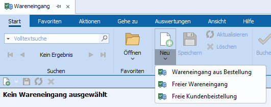 Schritt 1: Anlegen eines neuen WareneingangsÖffnen Sie das Modul Wareneingang und wählen Sie in der Symbolleiste die Schaltfläche "Neu". Es öffnet sich ein Auswahlfenster.
